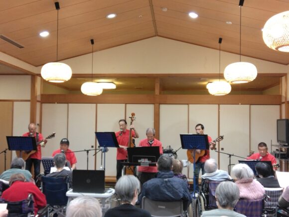 島田市内で活動されている、フォーティストリングスというギターサークルの方6名にお越しいただきました。歌とギターの演奏を披露してくださいました。