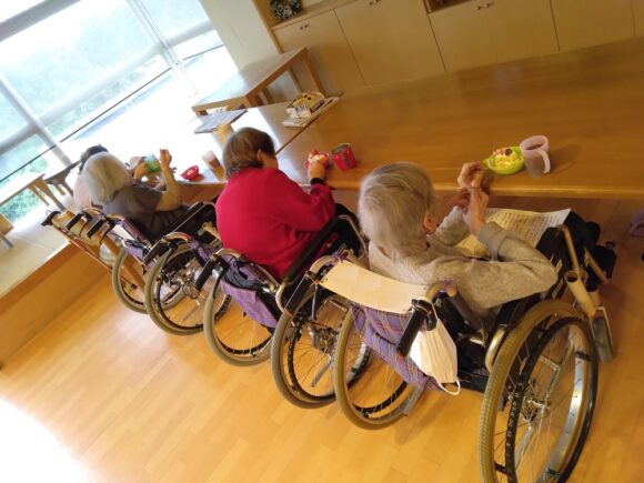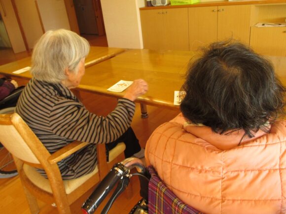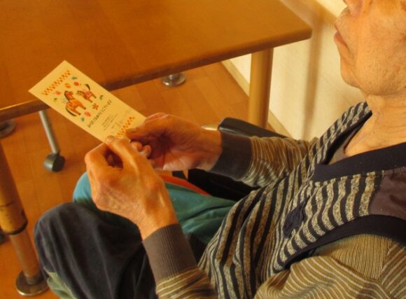 午の絵柄を見たり、職員からの言葉を読まれ、入居者様同士でお話が弾んでいるご様子でした。