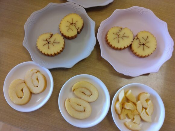別の日になりますが、3階ユニットではお正月らしい器に盛り、「寿」のかまぼこ、伊達巻、練り切りを提供させていただきました。