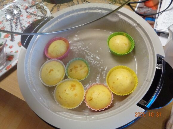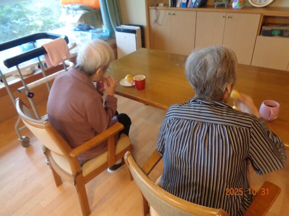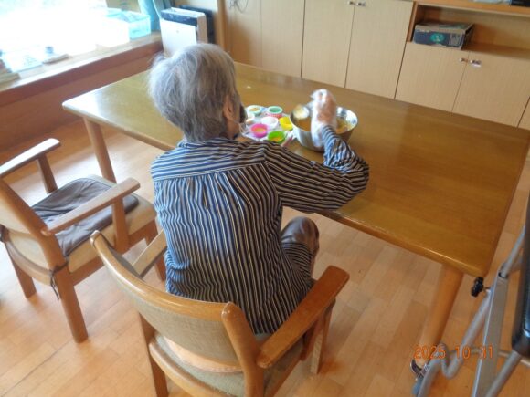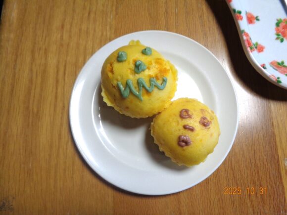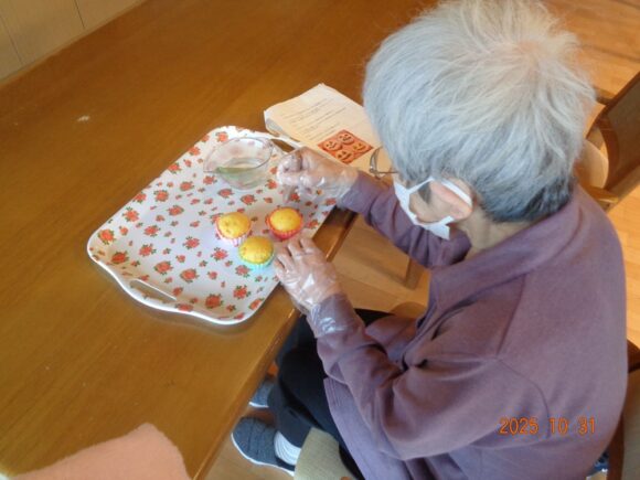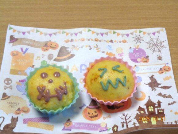 ハロウィンの季節に合わせ、かぼちゃを使った蒸しパンを作り、召し上がっていただきました。