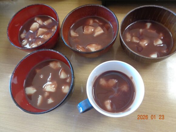 おしるこは、浮腫みや便秘の改善に効果があると言われています。健康効果のある食べ物で、寒い冬に身体の芯から温まっていただけたご様子でした。